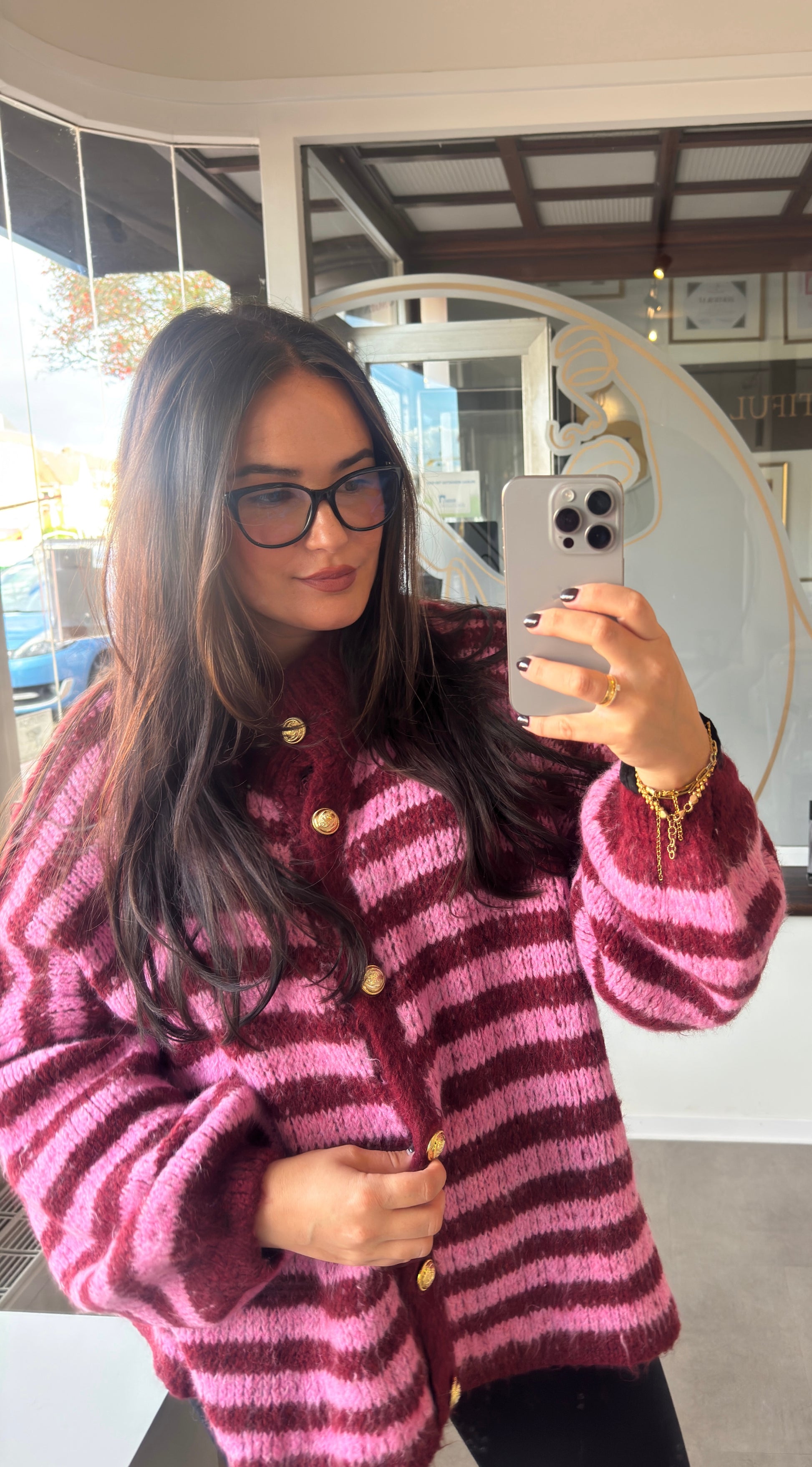Der Golden Stripes Cardigan vereint kuschelige Wärme mit modernem Design. Die markanten Streifen in harmonischen Farbkombinationen machen ihn zu einem echten Hingucker, während die edlen goldfarbenen Knöpfe dem Look eine elegante Note verleihen.
